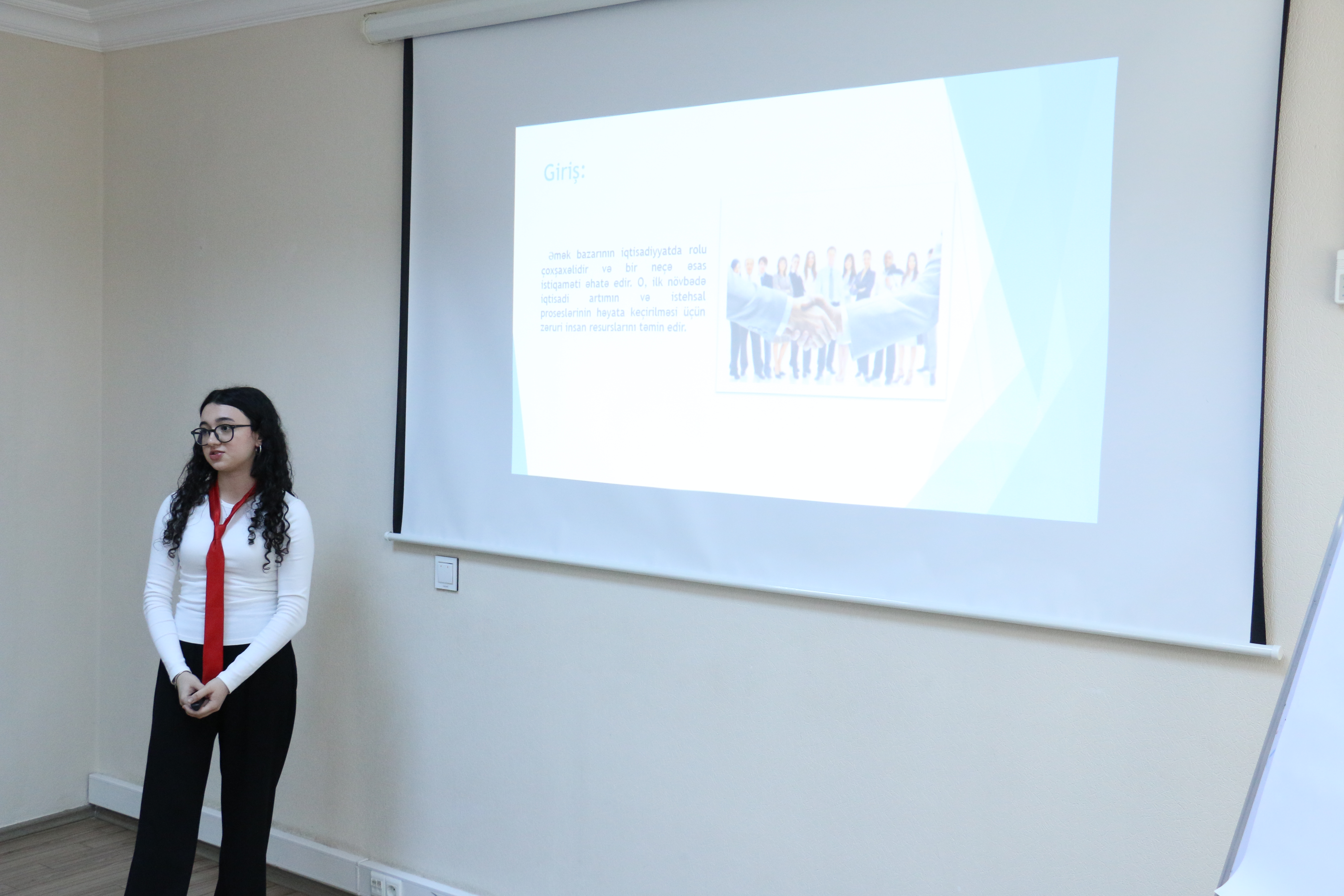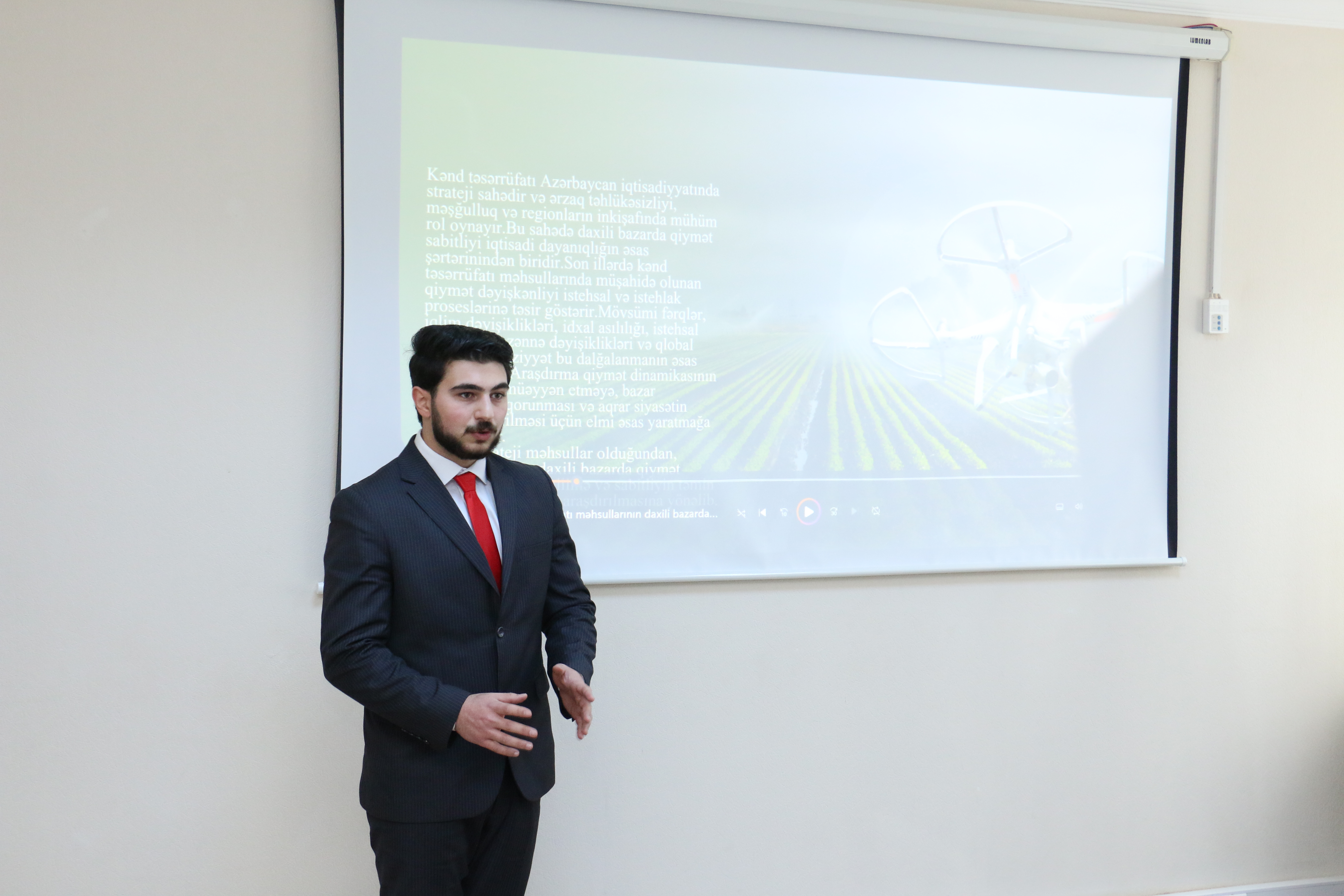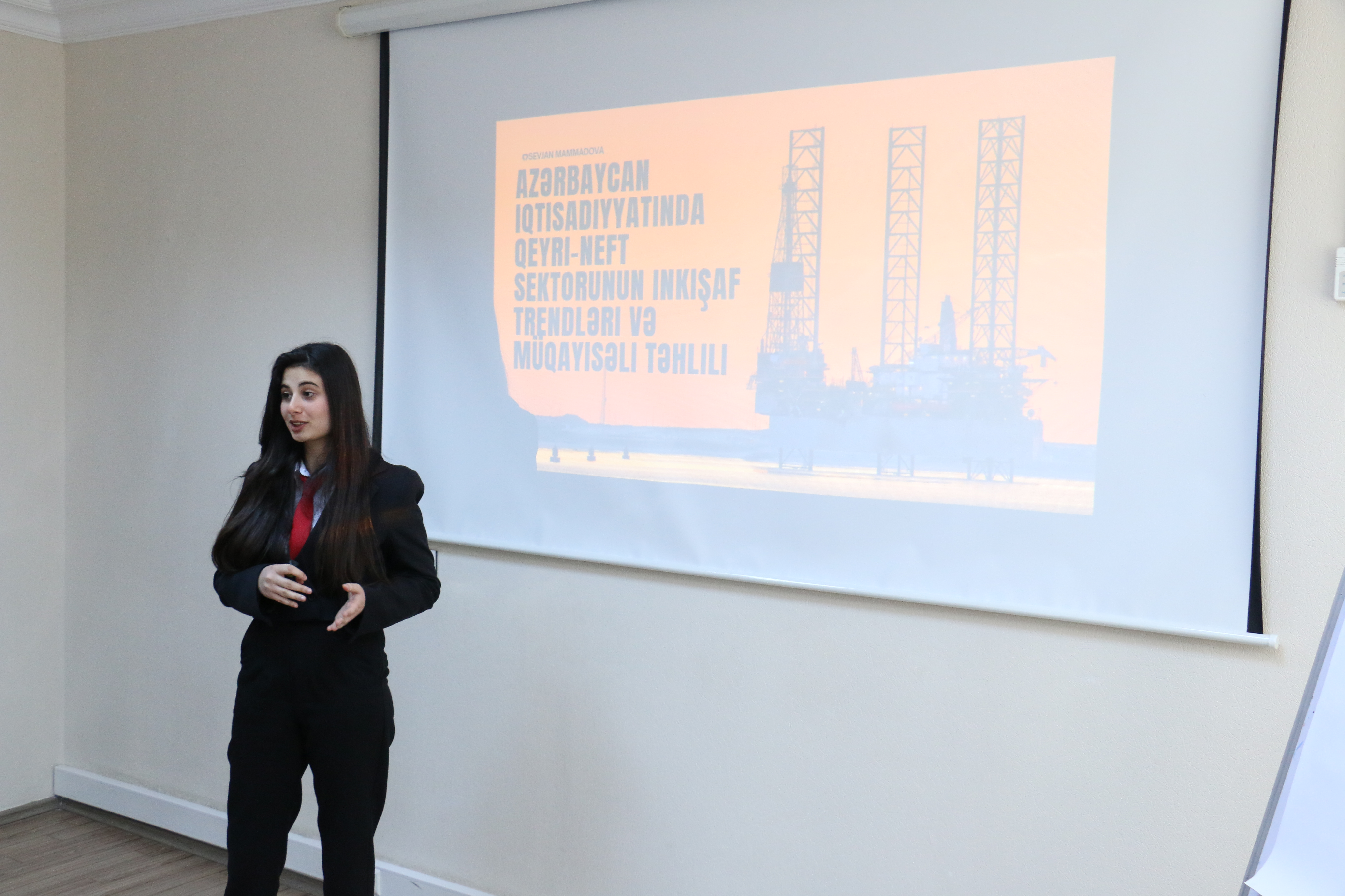 Prezident yanında Dövlət İdarəçilik Akademiyasının tələbəsi Misir Məmmədov "Effektiv layihə planlaması - layihə üçbucağı" mövzusunda, Azərbaycan Memarlıq və İnşaat Universitetinin tələbəsi Turan Sadıqov "Azərbaycan kənd təsərrüfatı məhsullarının daxili bazarda qiymət dəyişkənliklərinin təhlili" mövzusunda, Azərbaycan Dövlət İqtisad Universitetinin tələbəsi Sevcan Məmmədova "Azərbaycan iqtisadiyyatında qeyri-neft sektorunun inkişaf trendləri və müqayisəli təhlili" mövzusunda, Azərbaycan Dövlət Neft və Sənaye Universitetinin tələbəsi Ülviyyə Qurbanova "Eksport və e-ticarət" mövzusunda Azərbaycan Dövlət İqtisad Universitetinin tələbəsi Məlahət Tatanlı “Azərbaycanda əmək bazarının mövcud vəziyyətinin təhlili” mövzusunda çıxış ediblər.